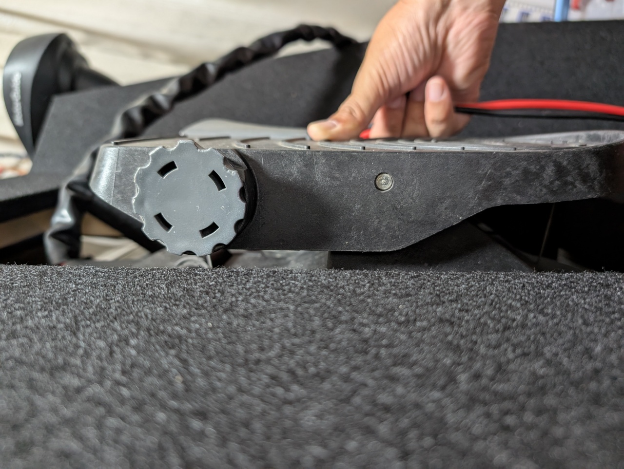 このネジが打ってあったところに、深さを稼ぐゲタを入れれば良いのではないかと。ゴム足なしのペダルでツライチを目指すなら3cmのゲタを入れる必要があるのですが、側面の板がワンバイ材ですのでワンバイ材だと3cmというちょうど良いのがありません。(カットすれば用意できますが)他の角材だと確か2.4cm角になるのではないかと。
