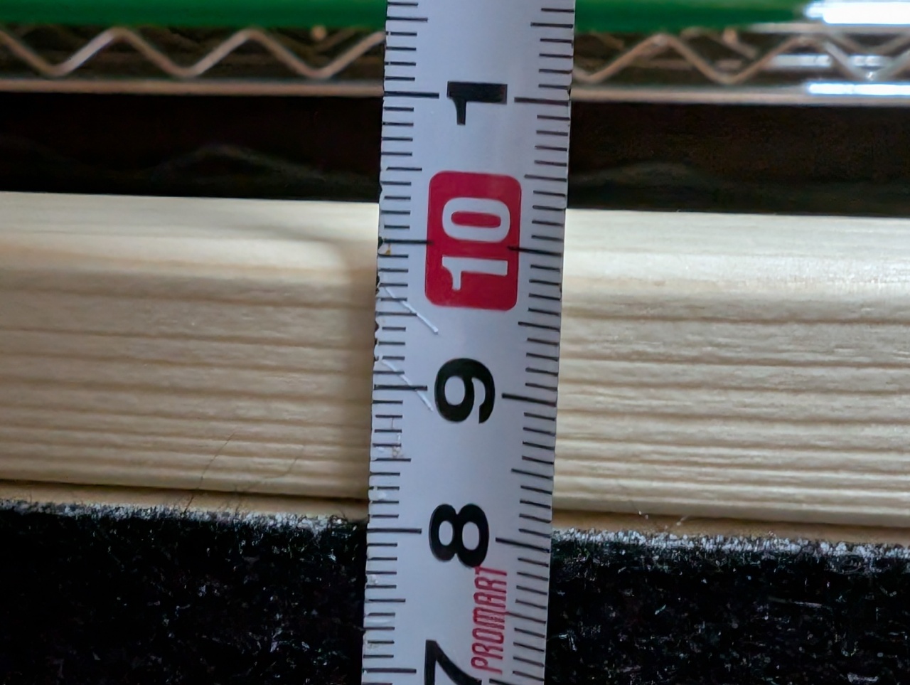 リセストレイ側面の板に1×1材を仮でのせて深さを測定。ほぼ10cmです。