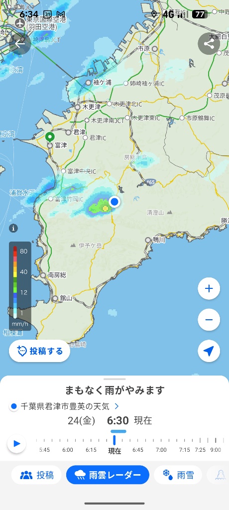 現地到着時の気温は12℃でボートセッティングしていると良い感じなのですが、終わって出船待機中は寒かったです。しかも、6:30過ぎに結構な勢いで雨が降ってくる始末。