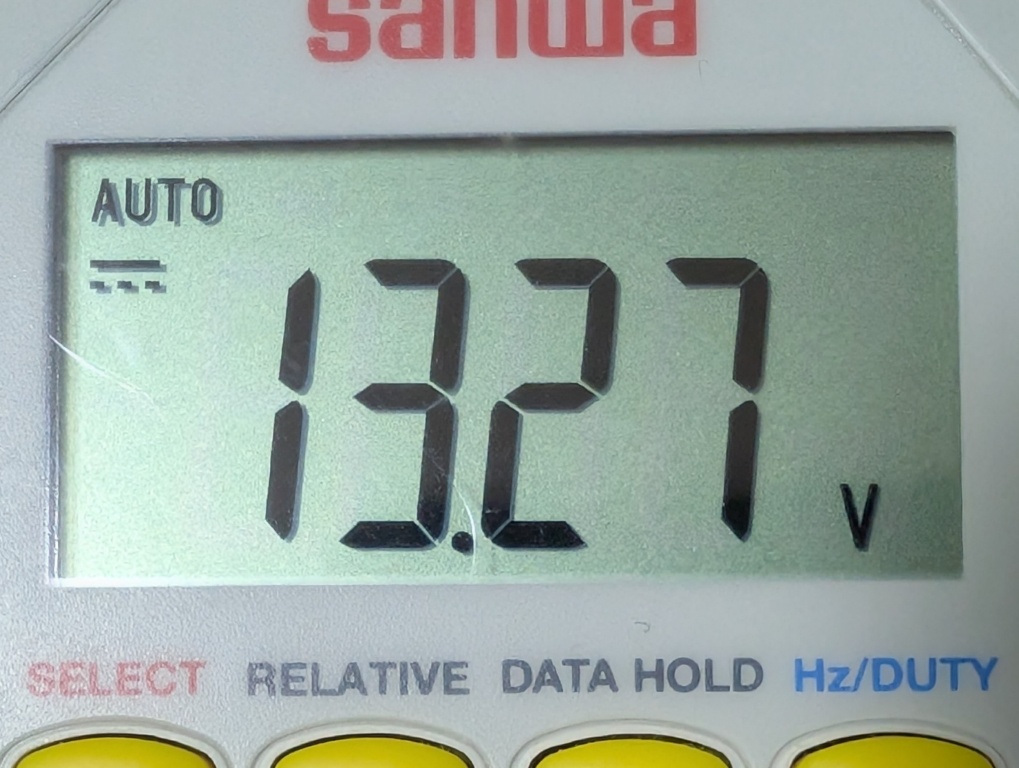 帰宅してから測定したバッテリ電圧は13.27Vでした。チャートによれば残容量は70%〜90%ということになります。エレキのみでの使用です。