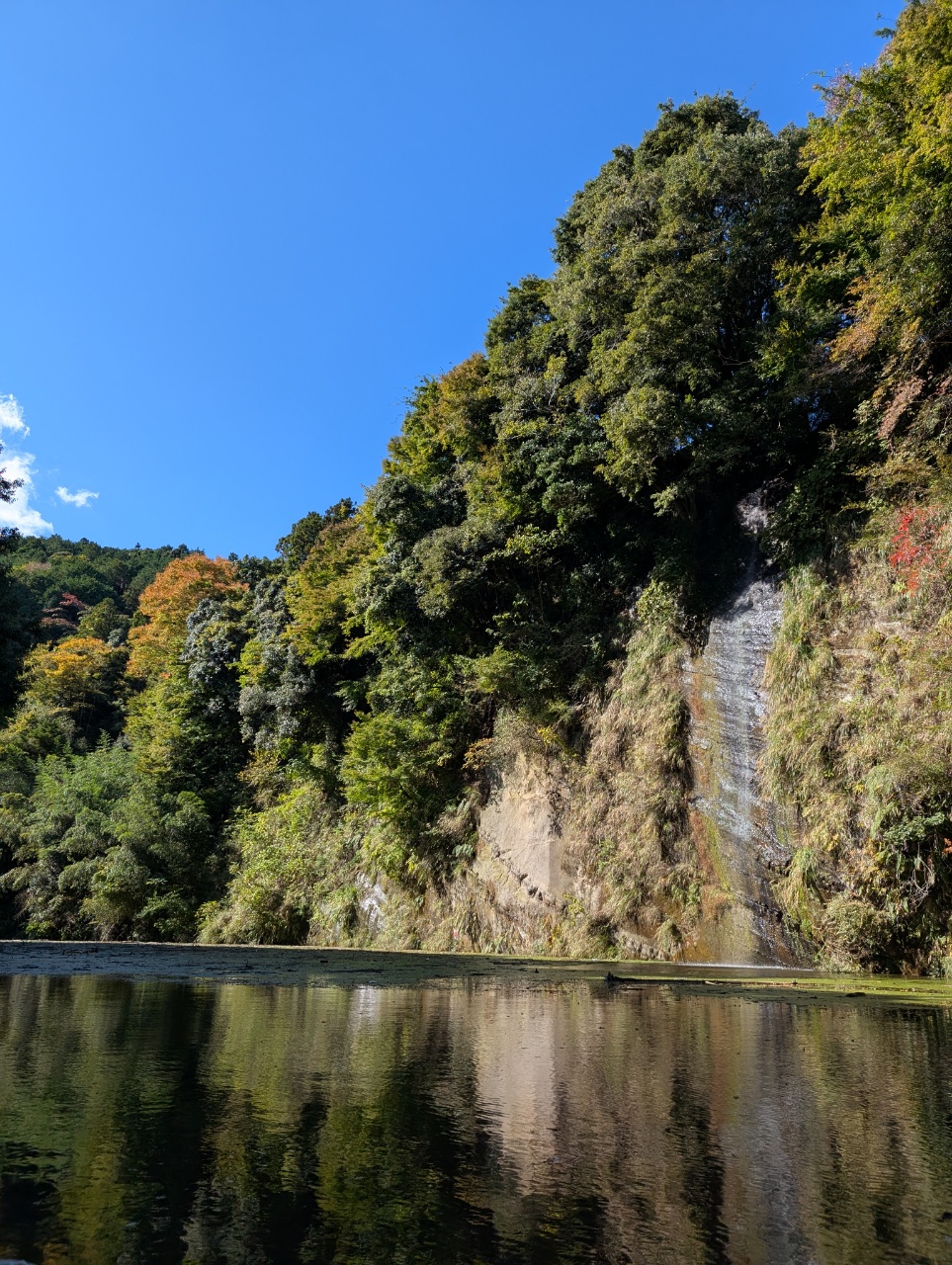 後ろからのんびり船団についていくと、最初の曲がりの外側の岩盤脇に誰も入っていません。とりあえず前回の釣行でヒントを得たリグを岸際に投げ込み10秒くらい沈めたら魚信が。