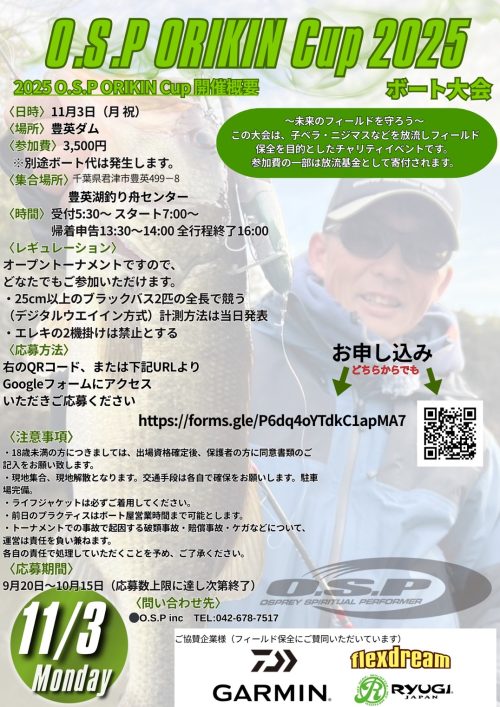 今日は千葉県君津市にある豊英湖で開催された「O.S.P ORIKIN Cup 2025」に参加してきました。目の手術をしてから大会の類はちょっと敬遠していたのですが、あのオリキンの冠大会というので参加を決意。
